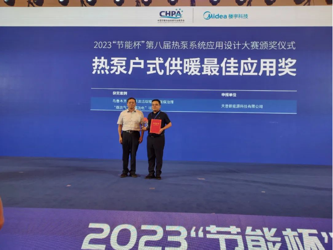 同期颁奖典礼上,天普凭借“乌鲁木齐市冬季清洁取暖农村散煤治理‘煤改气’‘煤改电’项目”荣获2023“节能杯”第八届热泵系统应用设计大赛“热泵户式供暖**应用奖”。