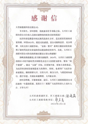 企盼·繁兴 合作共赢|天普新能源收到大兴区工商联发来的感谢信发表时间:2024-03-20 09:46 近日,天普新能源收到来自大兴区工商联的感谢信,信中对天普过去一年来对工商联事业的支持,在企盼·繁兴系列主题活动中作出的积极贡献表示了衷心的感谢!