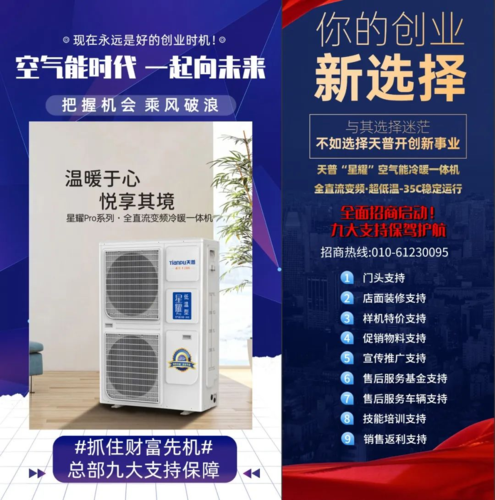 天普作为新能源企业,天普将聚焦主业、精细运营,精中创新,用工匠精神彰显责任与担当。同时,为顺应全球绿色低碳发展大势,立足空气能行业爆发式发展态势,天普团队将全心全意为合作伙伴服务。在市场开拓上,全面立足经销商的角度,想经销商之所想,给予经销商全方位的扶助,让经销商无后顾之忧,是创富的坚强后盾。同时,天普不仅有着丰富的应用经验和良好的市场口碑,更有优惠的招商政策和完善的线下扶持,从品牌支持、门店支持、开业支持、市场运营支持、广告宣传支持、人员支持、培训支持、终端品牌推广支持、渠道开发支持、物流支持等方面,对经销商进行全面帮扶!因此,以此招商活动为契机,并邀请更多的伙伴加入天普,共同打造财富之路,一起助推“双碳”目标稳健发展,共赢绿色健康美好未来。